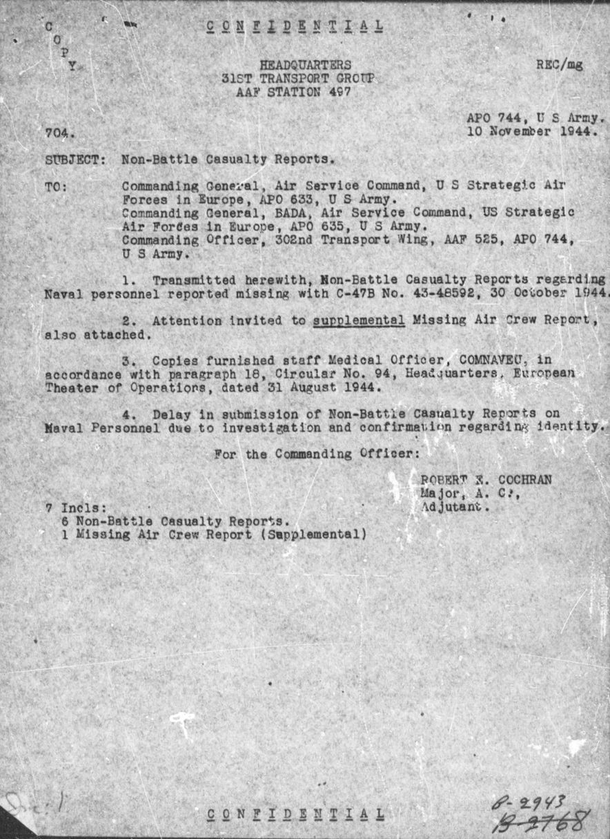 Including Blacker, there were 12 onboard this flight. This included Photographer's Mate, First Class Junius J. Stout was a last-minute addition to this flight. He was not registered as a passenger, but it appears his final destination was to return to England via Querqueville. Stout was one of the many US Navy Photographers who captured the D-day invasion and subsequent battle of Normandy.